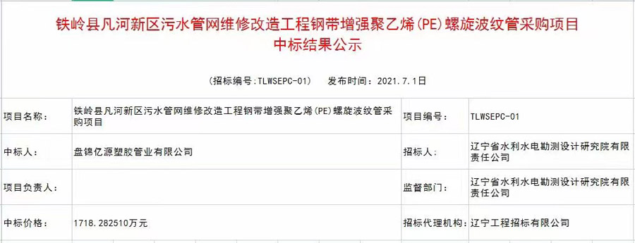 一份耕耘一份收獲,億源管業(yè)[爆竹][爆竹][爆竹]成功中標國家環(huán)保督察項目鐵嶺凡河污水管網(wǎng)改造,鋼帶增強聚乙烯螺旋波紋1718.282510萬元。億源管業(yè),追求卓越品質(zhì),致力于打造市政管道優(yōu)質(zhì)品牌。